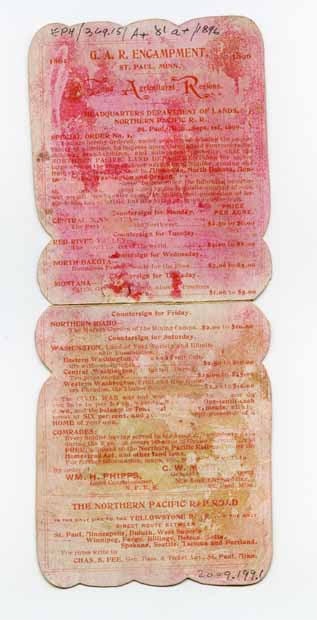 "Attention, comrades : the land department of the Northern Pacific Railroad can help you, if you desire to obtain a home of your own," prospectus describing railroad lands open for settlement, intended for 30th encampment of the Grand Army of the Republic, compliments Land Dep't. N.P.R.R, 1896.. Item is shaped like a Civil War soldier's sleeping rolls, with G.A.R. emblem and flag.